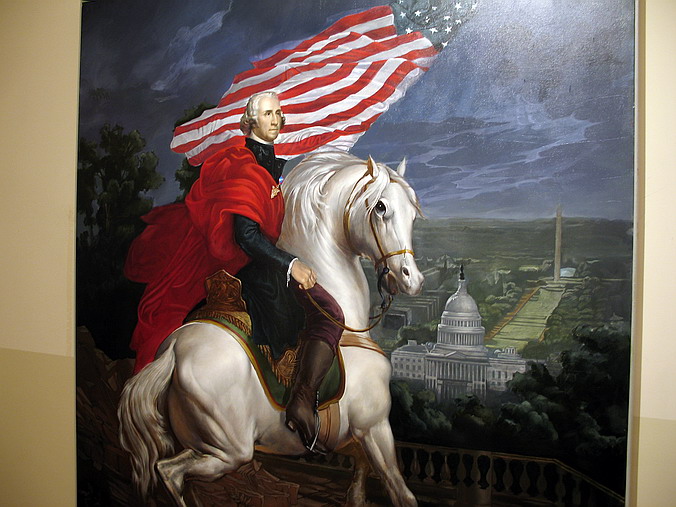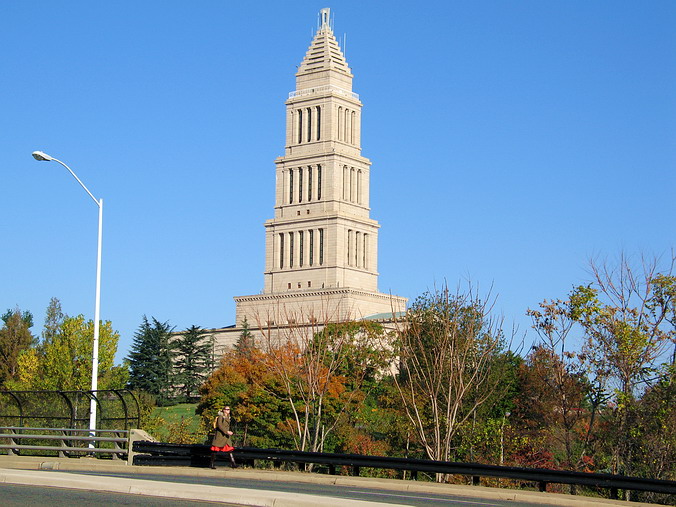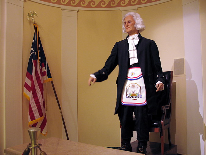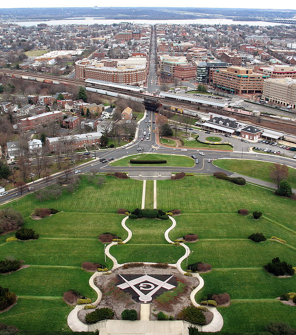 George Washington Masonic National Memorial.  С того времени, как стал прилежным и где-то даже закоренелым пользователем станции вашингтонского метро "King Street", не давала покоя периодически возбуждающаяся познавательно-исследовательская жилка: что же это все-таки за монумент такой занял тут командные высоты? Расположен     так, что неминуемо цепляет взгляд, а собой напоминает маяк (lighthouse – это отдельная история: на тему "лайтхауза" крыши у Америки слегка съехамши, и большинство "исторических" памятников – именно они…). Когда-то теплилась надежда, что, может, это простые каменщики сподобились и воздвигли сей памятник (mason – каменщик, правда сейчас это звучит более прозаично: bricklayer), но, рассуждая трезво, откуда у работяг такие деньги? Да и знак-циркуль отбросил все сомнения: нет, это масонский национальный мемориал Джорджа Вашингтона. Хотя, как показало пусть и не слишком глубокое изучение вопроса на месте, масонство изначально возникло именно с союза каменщиков, некоторые из которых позже, в 17-м веке, стали вдруг интересоваться греко-римской архитектурой. Представляете, сложил печь-камин, стряхнул пыль, сел на завалинку и замечтал: а как там у них, в Греции-то?… Затем на этой базе как-то образовался союз-братство (fraternity) из желающих глубже познать архитектуру и ее пропорции, а заодно и правду, мораль, этику… Ну и пошло-поехало.