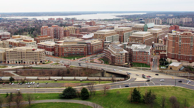 USPTO. Alexandria, Virginia. Вид с высоты George Washington Masonic National Memorial. Во глубине патентных руд…