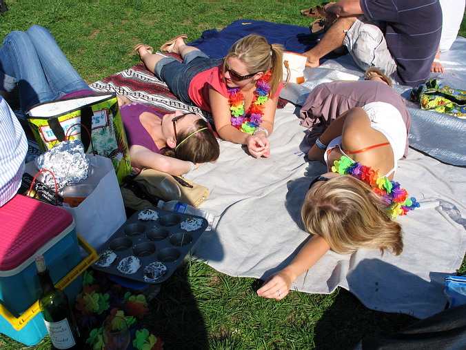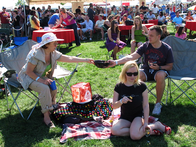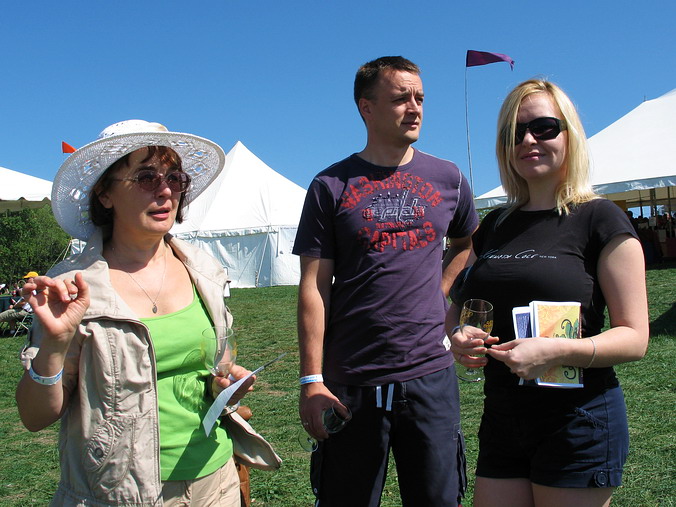 Куда ты, тропинка, меня привела?.. Надо признаться, ранее наша тропинка не заводила нас на подобные мероприятия: ведь вместо входного билета туда можно просто купить одну-две бутылки хорошего вина (или чего покрепче) и далее по схеме "нет повода не выпить" со всеми вытекающими. Само собой, при этом может рухнуть не только вековая тяга к культуре пития, но и будет упущено главное достинство фестивальных дегустаций: непосредственный доступ к огромному разнообразию отменных вин. Будучи новичками культурно-массового потребления алкоголя в малых дозах, мы не сразу въехали во все нюансы этого процесса. Фужеры в руках – в атаку! Остановились у первого попавшегося на пути винного родника, ждём, а стоящие "у прилавка" как-то зависли и явно не торопятся: что-то обсуждают, чмокают губами и по новой подставляют свои бокалы. Посетила предательская мысль не начать ли работать локтём-плечом-коленом, но мы и раньше были невеликие в этом мастера. К счастью, очень быстро раскусили, что действо это происходит в виде мини-лекции–презентации виноделами своего демонстрационного набора из 7-8 различных вин. Довольно скоро, вооружённые этим знанием, мы уже и сами не торопились, швартуясь у очередной винокурни, чтобы нам накапали пол-стакана, со знанием дела и многозначительно смотрели на свет, нюхали и опрокидывали очередные "пять капель". Поначалу мы "рванули на 10,000 как на 500" – после двух-трёх заходов жизнь резко стала веселей, и всё понеслось как в той песне: “а вокруг меня прохожие шли на ангелов похожие… дивно пахла резеда”. Плюс атмосфера праздника: и погода солнечная, и живая концертная музыка повсюду, все весело возбуждены, а людей-то – тысячи и тысячи. Вина оказались ну очень разные. В самом начале мы набрели на «Крайсалис» (Chrysalis), пришли от него в восторг и думали, что так будет и везде – нет, конечно. В общем, выступили мы достойно, сумели и концерт посмотреть и себя показать, и, не сбавляя оборотов, закрепили полученные знания семейным барбекью… Немного фотоматериала с культурно-массовой пьянки: Часть 1,